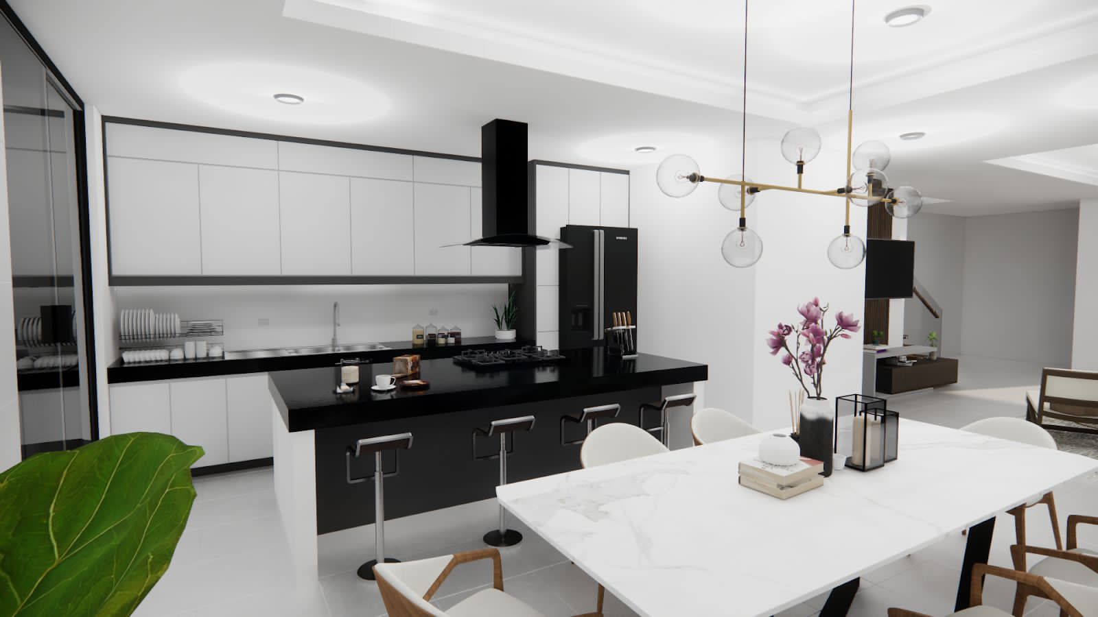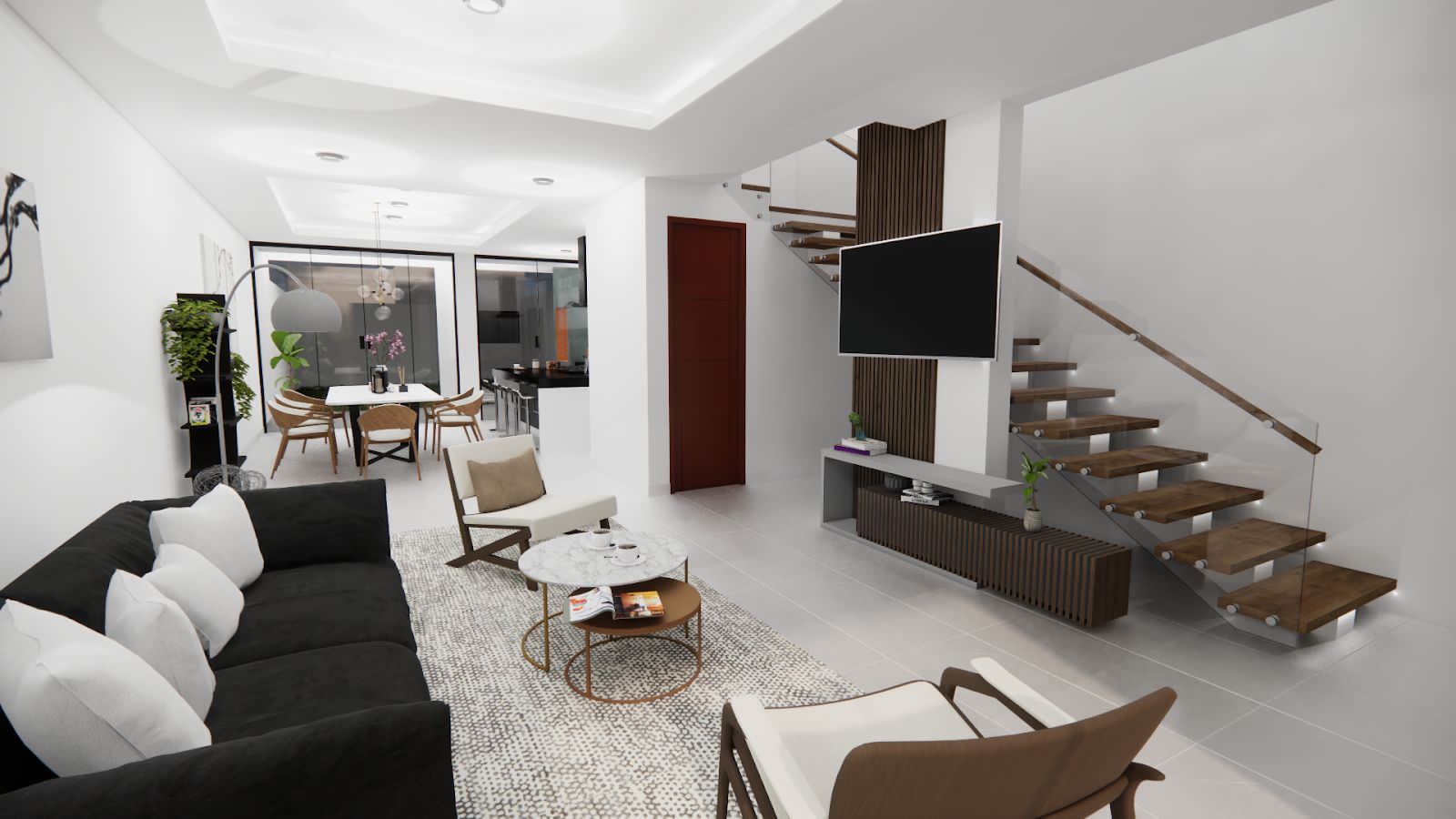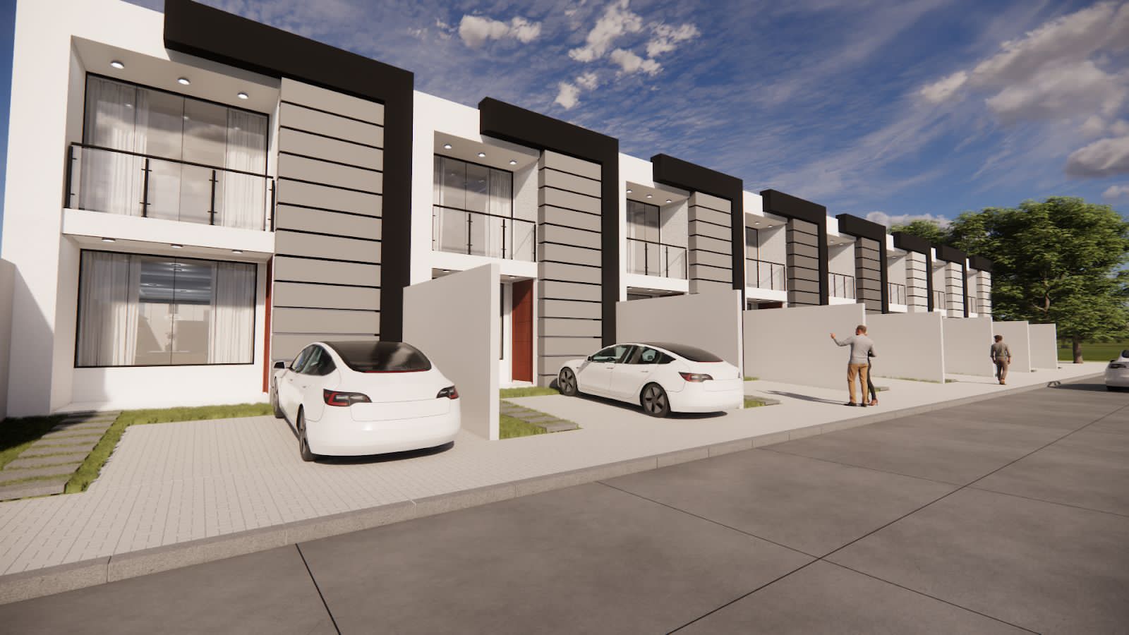 Recibidor, living – comedor, cocina, baño de visita, churrasquera, área de servicio, jardín y parqueo para dos vehículos.